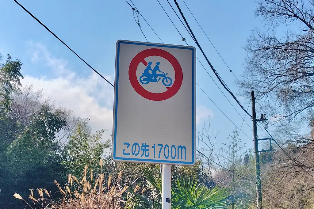 この先に二輪車規制があることを示した標識。これを見かけたら、安全な場所で早めにUターンを