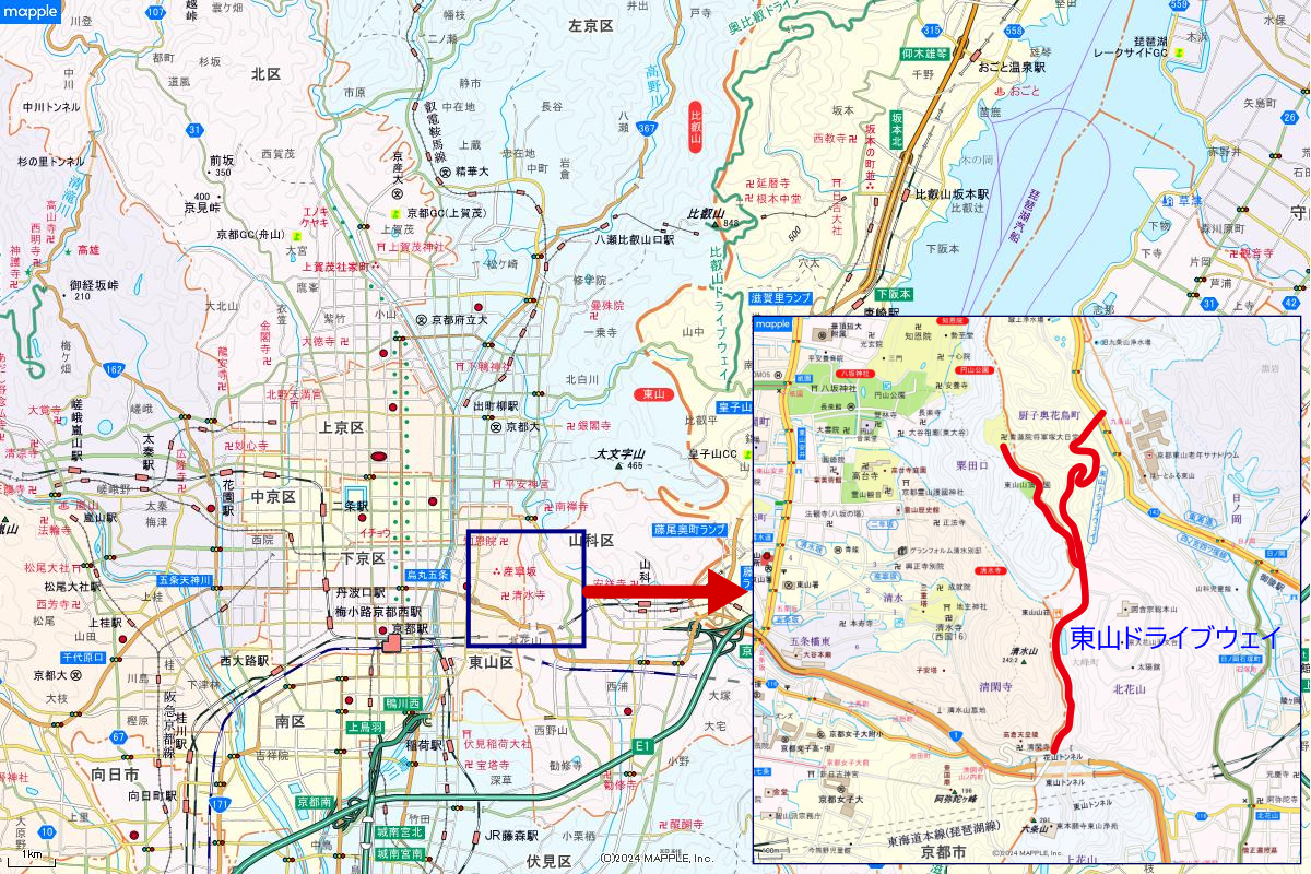 東山ドライブウェイは京都市の東側に位置。全線約7kmで、途中には「東山山頂公園」や「将軍塚」といった展望スポットがある