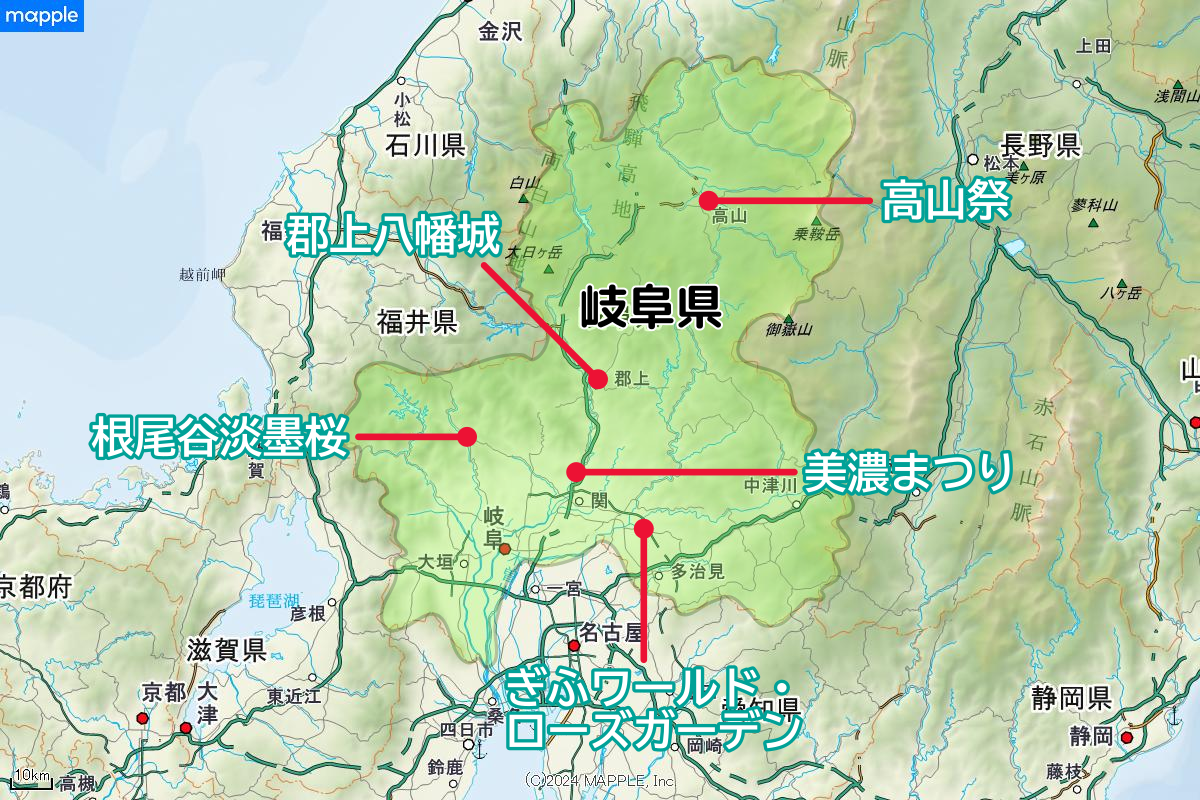 1. 根尾谷淡墨ザクラ 花の見ごろ:3月下旬~4月上旬 2. 春の高山祭(山王祭) 開催日:4月14日~4月15日 3. ぎふワールド・ローズガーデン 花の見ごろ:4月上旬~5月下旬 4. 郡上八幡城 花の見ごろ:3月下旬~4月上旬 5. 美濃まつり 開催日:4月11日~4月12日