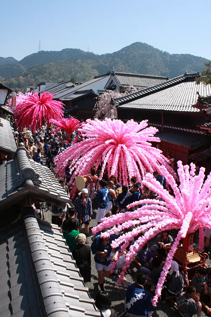 「うだつの上がる町並み」を、美濃和紙で作られたピンク色の「花みこし」が埋め尽くす光景は圧巻です。土曜日の勇壮な神輿と、日曜日の静かな「山車・仁輪加(にわか)」という動と静の歴史文化を体験できます。