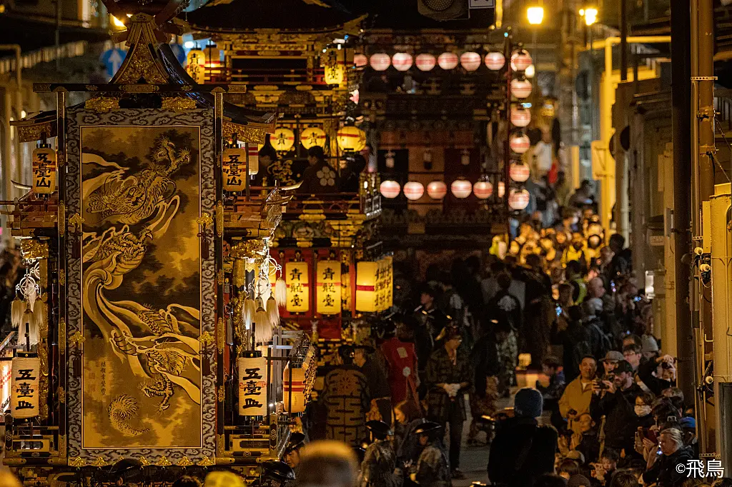 飛騨の匠の技が結集した豪華絢爛な祭屋台が最大の見どころの高山に春を告げる祭りです。日中の曳き揃えに加え、4月14日夜の「夜祭」では、各屋台に100個もの提灯が灯され、古い町並みを幻想的に照らします。
